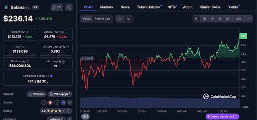 A Solana continua demonstrando força no mercado. O preço atual da Solana é de $234,76, com um aumento de 1,21% hoje. Seu valor de mercado atingiu $111,47 bilhões, refletindo grande interesse na plataforma.