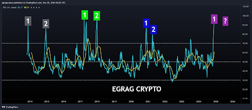 Após o primeiro pico do RSI, o indicador normalmente cai antes de subir novamente, formando o segundo e último pico do ciclo de alta. Esse comportamento cíclico sugere que a história pode se repetir, com um possível pico de topo duplo em 2025.