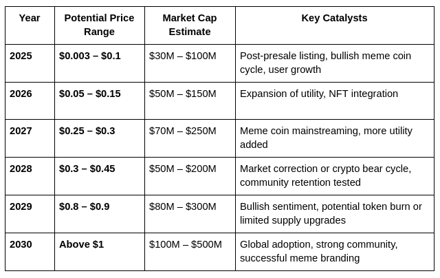 Analisamos as trajetórias de preço de meme coins similares em seus estágios iniciais (como PEPE, FLOKI e DOGE) e aplicamos curvas de crescimento comparáveis com base na avaliação da pré-venda, taxa de crescimento da comunidade, anúncios de parcerias e utilidade (ou utilidade percebida).